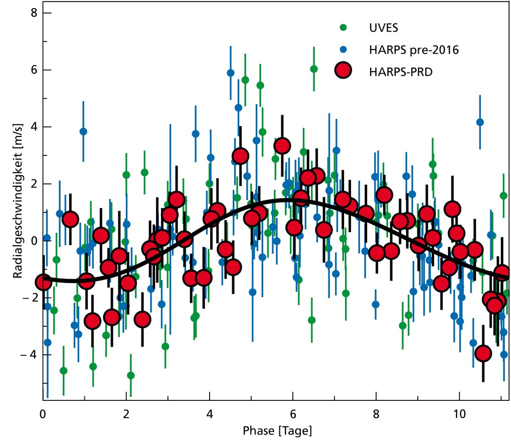 Martin Kürster sagt: “Bereits in unseren alten Messungen zeigte sich ein Signal, das einem Planeten mit Umlaufdauer 11,2 Tagen entspricht. Aber es ist allein mit unseren Daten nicht möglich zu entscheiden, ob das Signal tatsächlich von einem Planeten stammt oder durch eine zufällige Kombination von Störeinflüssen entstanden ist. Kombiniert man unsere Daten dagegen mit den neuen Messungen, dann bestätigt sich, dass die Pale-Red-Dot-Kampagne tatsächlich einen echten Planeten gefunden hat. Ein Störsignal auf der Basis stellarer Aktivität wäre über die vergangenen 17 Jahre unmöglich so konstant geblieben."