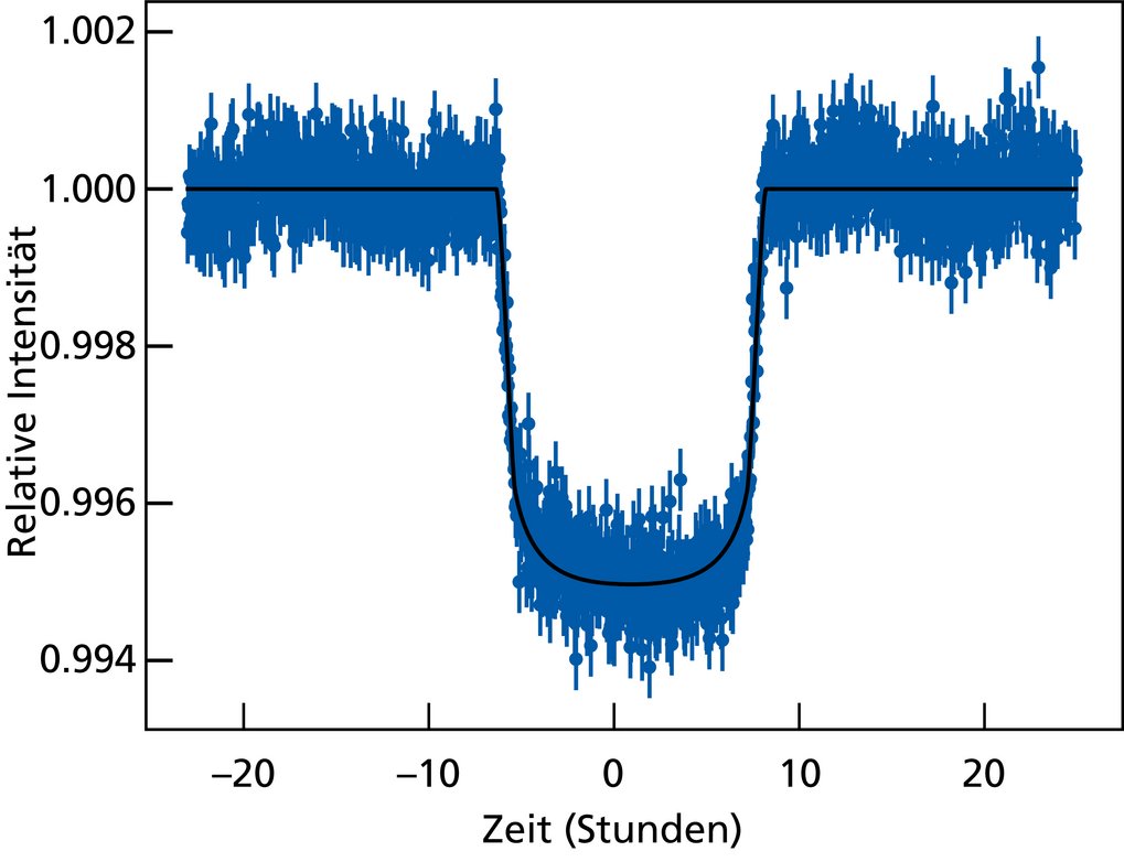Während die Astronomen diese so genannte Radialgeschwindigkeitsmethode anwenden, um auf die Masse und die Umlaufzeit eines Planeten um seinen Zentralstern zu schließen, müssen sie zur Bestimmung seiner Größe auf eine andere Technik zurückgreifen. Nehmen wir an, dass die Planetenbahn so ausgerichtet ist, dass sie zufällig den Zentralstern kreuzt. Man nennt ein solches Ereignis einen „Transit“. Wenn dies geschieht, lässt sich aufgrund der periodisch auftretenden winzigen Abschwächung des empfangenen Lichts während der Transits der Radius des Planeten berechnen und seine Umlaufdauer genauer bestimmen.