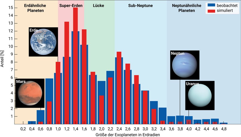 Der Größenbereich rund um die Lücke wird von zwei verschiedenen Arten von Exoplaneten bevölkert. Einerseits gibt es Gesteinsplaneten, die massereicher als die Erde sein können und deswegen Super-Erden genannt werden. Andererseits finden Astronominnen und Astronomen in fernen Planetensystemen vermehrt sogenannte Sub-Neptune (auch Mini-Neptune), die im Durchschnitt etwas größer als die Super-Erden sind.
