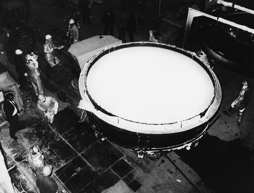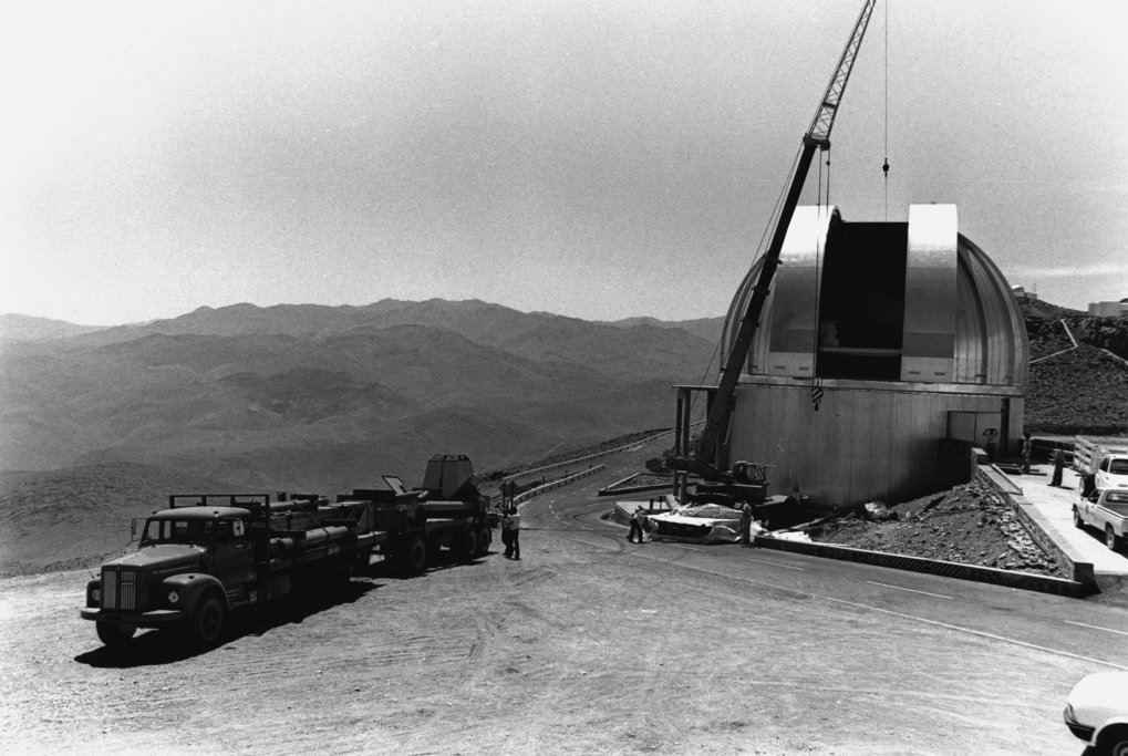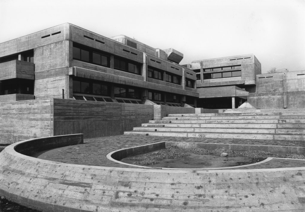 Das 1975 fertiggestellte Hauptgebäude des MPIA. Es ist im Sichtbetonstil (Brutalismus) gebaut und soll sich als „Felsgruppe“ seiner natürlichen Umgebung auf dem Königstuhl anpassen. Blick von Westen.