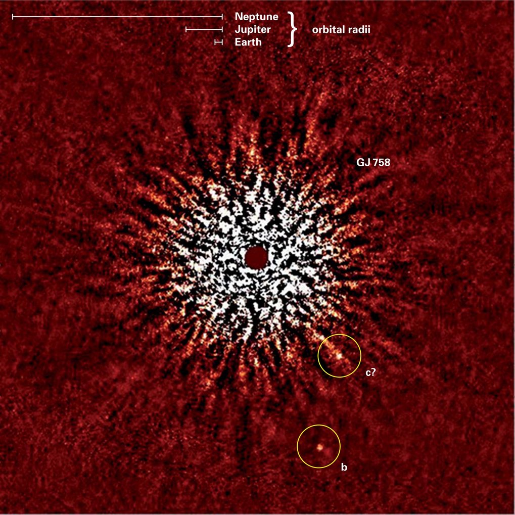 Now a new planet candidate, designated GJ 758 b, has been discovered and imaged with the 8-meter Subaru telescope on the summit of Mauna Kea in Hawai`i, using state-of-the-art adaptive optics to correct the blurring effect of Earth's turbulent atmosphere. The planet orbits the star GJ 758 in the constellation Lyra. While, on each of the images taken, the tiny spot representing the planet is lost in the host star's residual glare, it was possible to obtain an image of the planet by combining time-series of individual images, using a technique known as angular differential imaging (ADI) [1]. In this way, the astronomers were able to remove the star's halo from the image sufficiently well to reveal GJ 758 b's feeble glow.