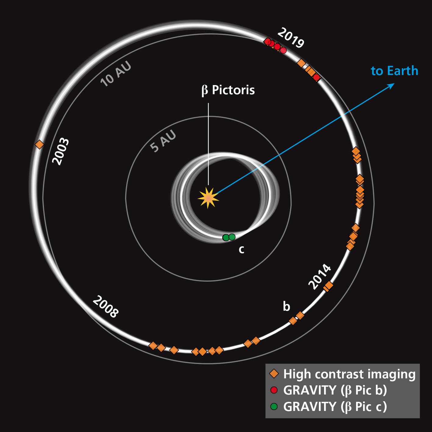 At a distance of only 63 light-years, in the small Southern constellation “Painter” (lat. Pictor), the β Pic system is one of the closest young stellar systems. By the time of the new observations, it had already been discovered to have a debris disk produced by colliding small bodies, a giant planet designated beta Pictoris b, and evaporating comets.
