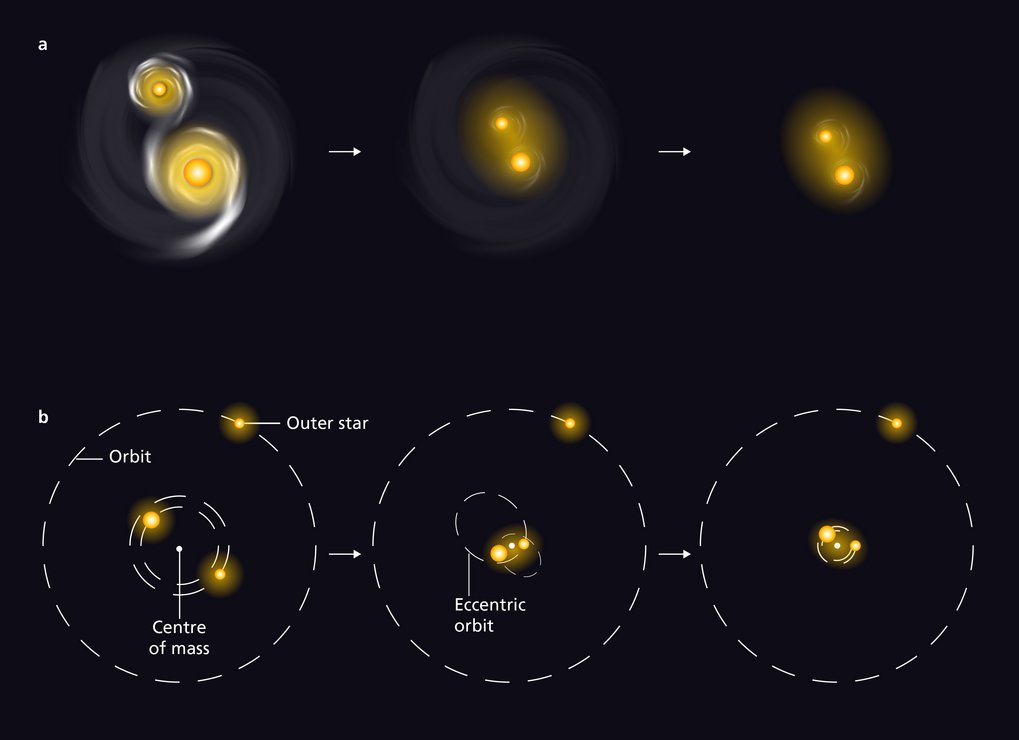 The second mechanism occurs in systems with a third, lower-mass star. Its gravitational force diverts the more massive companions into elliptical orbits that over time approach smaller and circular trajectories. The reduced orbital radii again lead to higher velocities. In some cases, the lower-mass star is ejected from the system.