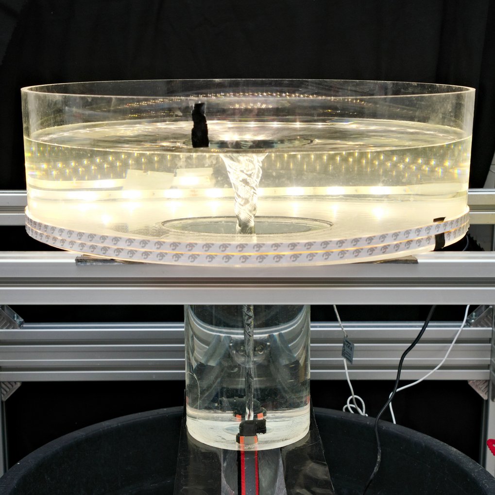 The water flow causes the fluid to rotate, forming a vortex whose surface extends from the bottom of the tank to the wall of the upper, 50-centimetre-wide cylinder. The usable experimental zone begins roughly 3 centimetres from the centre and extends almost to the tank’s edge. The shape of the water tornado fulfils the required property of mimicking a gravitational field.